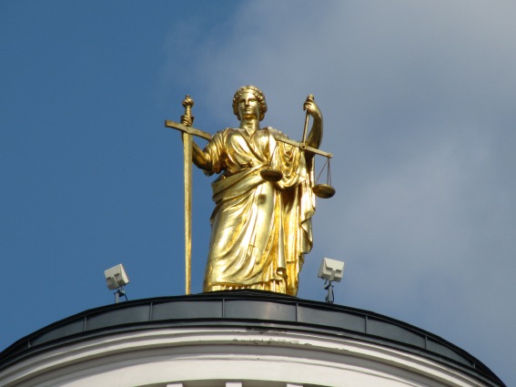 Die Themis-Statue "Gette" auf dem Rathausturm