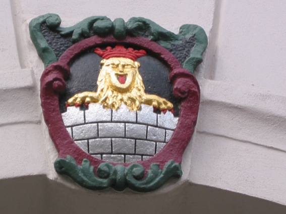 Zeulenrodaer Stadtwappen über einem Torbogen am Rathaus
